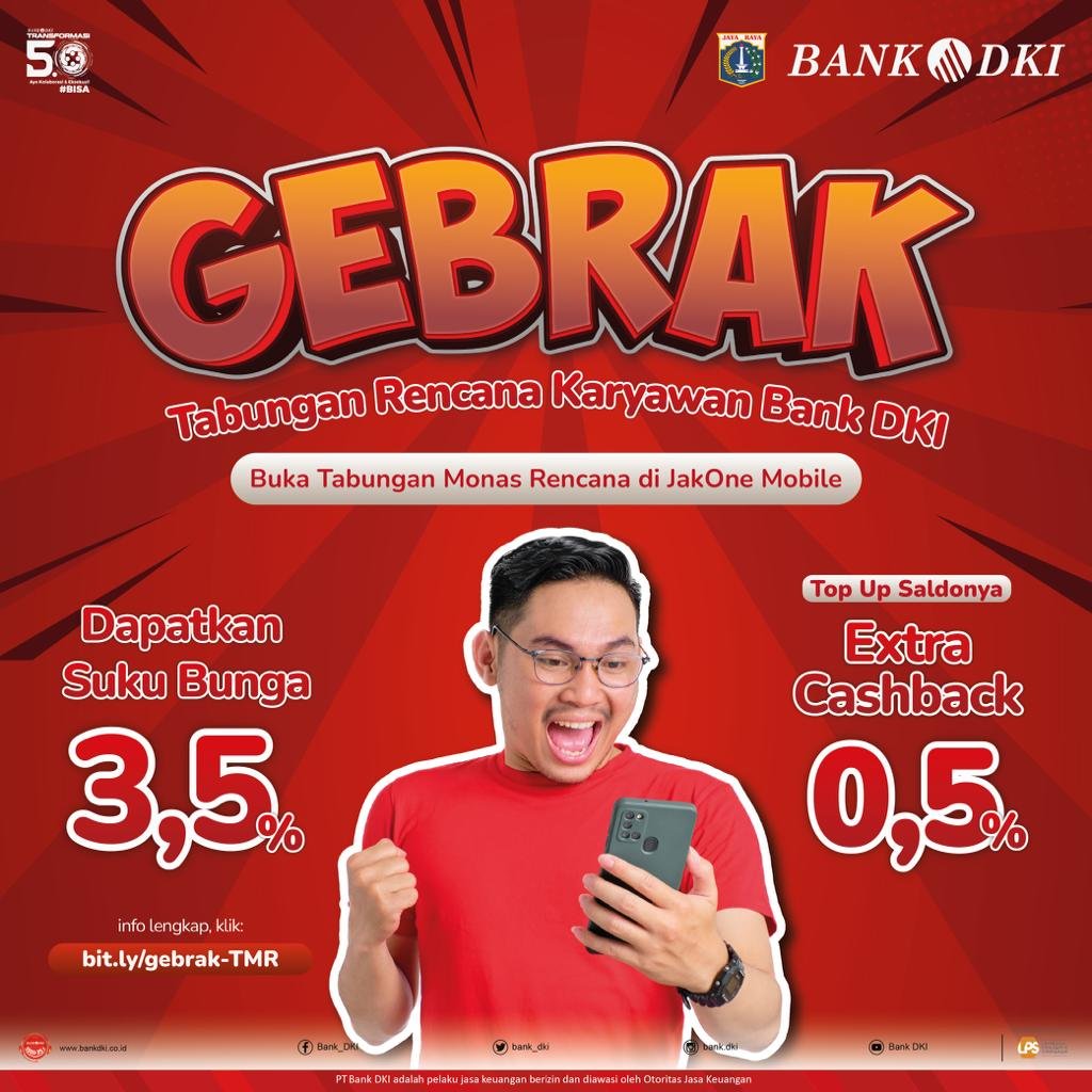 Program Gebrak Tabungan Rencana Karyawan Bank DKI adalah Program Khusus Karyawan Bank DKI dengan pemberian Extra Cashback sebesar 0,5% dan bunga pada rekening sebesar 3,5% hanya dengan membuka Tabungan Monas Rencana melalui JakOne Mobile dan melakukan Top Up saldo sesuai tiering yang sudah ditentukan.