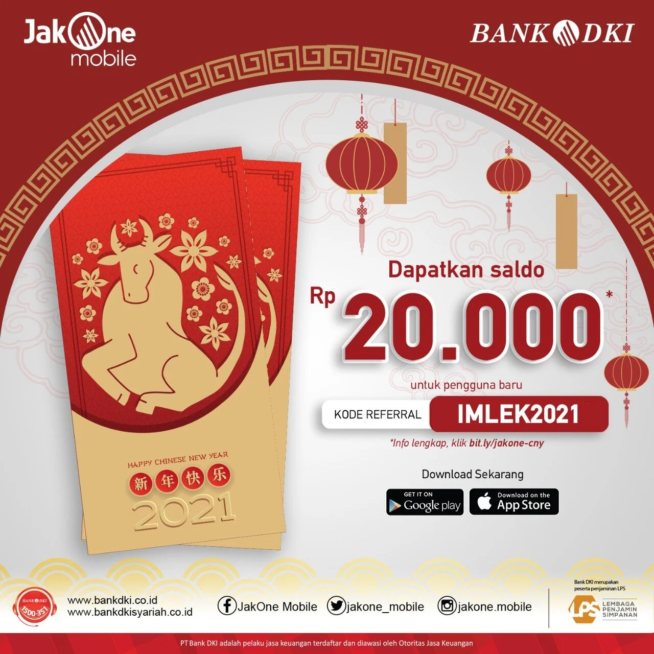 Dalam rangka memperingati Tahun Baru Imlek 2021 , ada promo menarik nih buat kamu yang masih belum download JakOne Mobile, jangan lupa gunakan Kode Referral IMLEK2021 untuk dapetin FREE Saldo Rp 20.000,-