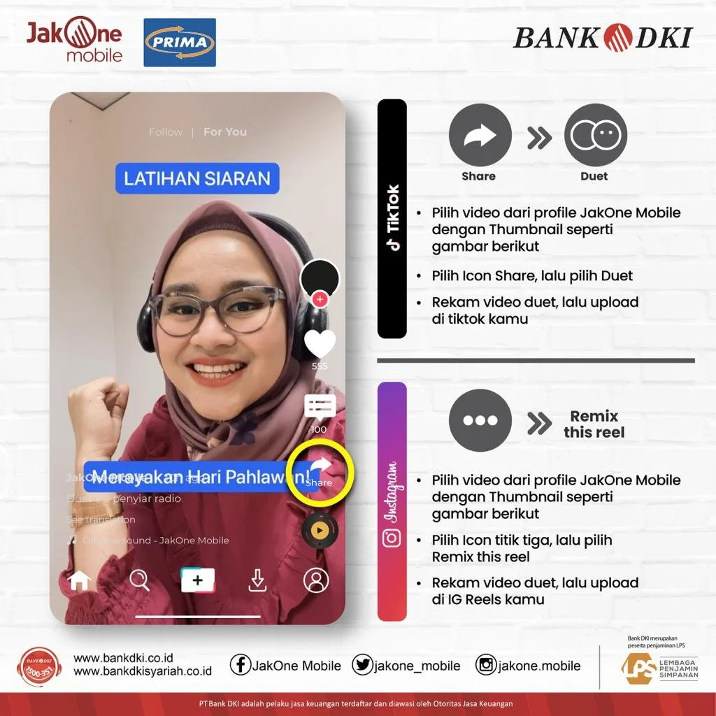 Gunakan hashtag #JakOneDuetChallenge #BankDKIxJaringanPrima dan #JakOneHariPahlawan pada caption