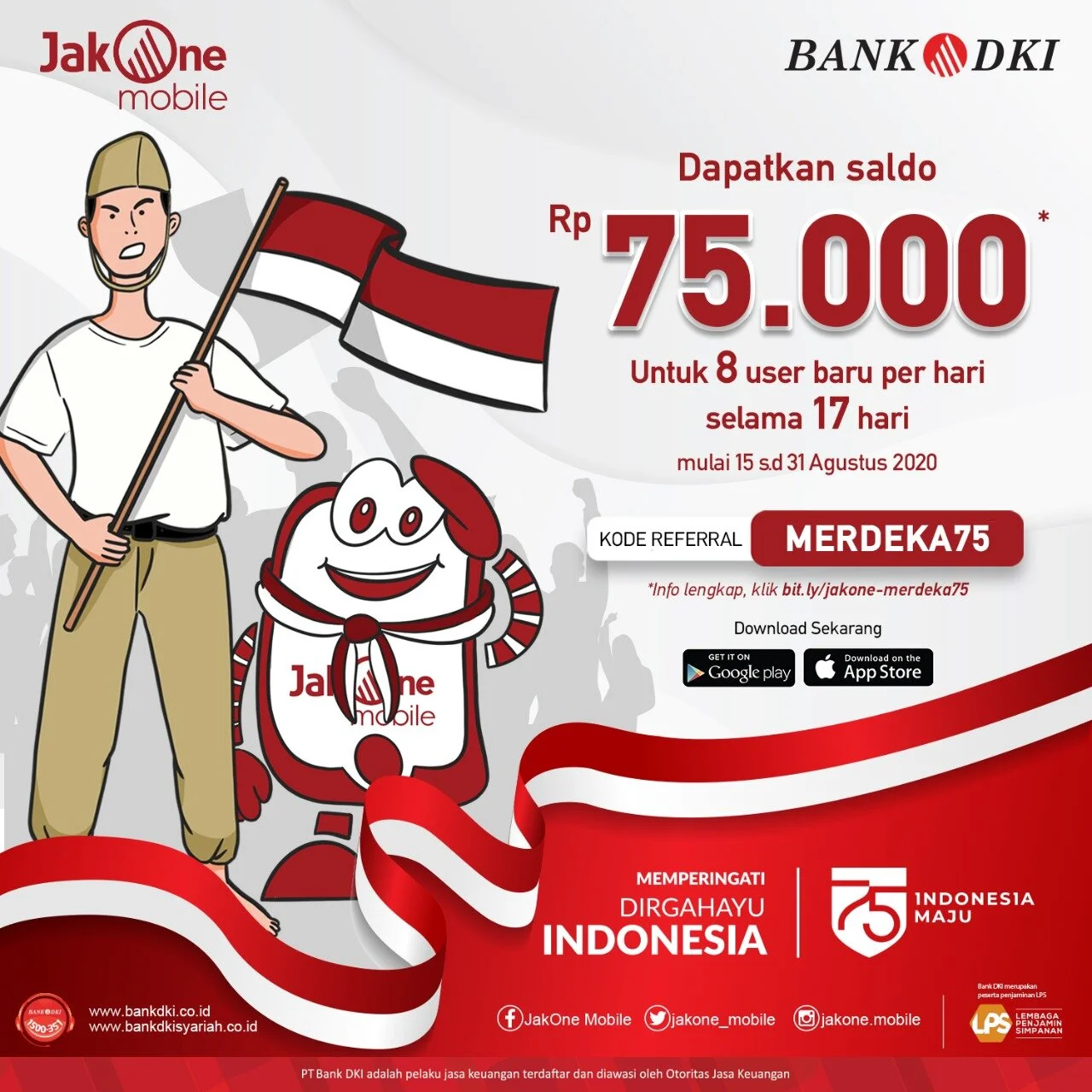 Dalam rangka memperingati Hari Kemerdekaan Republik Indonesia yang ke 75 , JakOne Mobile mau kasih promo menarik nih buat kamu yang masih belum download sampai saat ini, jangan lupa gunakan Kode Referral MERDEKA75 pada saat registrasi dan dapetin Saldo Rp 75.000,- (Tujuh Puluh Lima Ribu Rupiah) untuk 8 user/hari selama 17 hari dari 15- 31 Agustus 2020