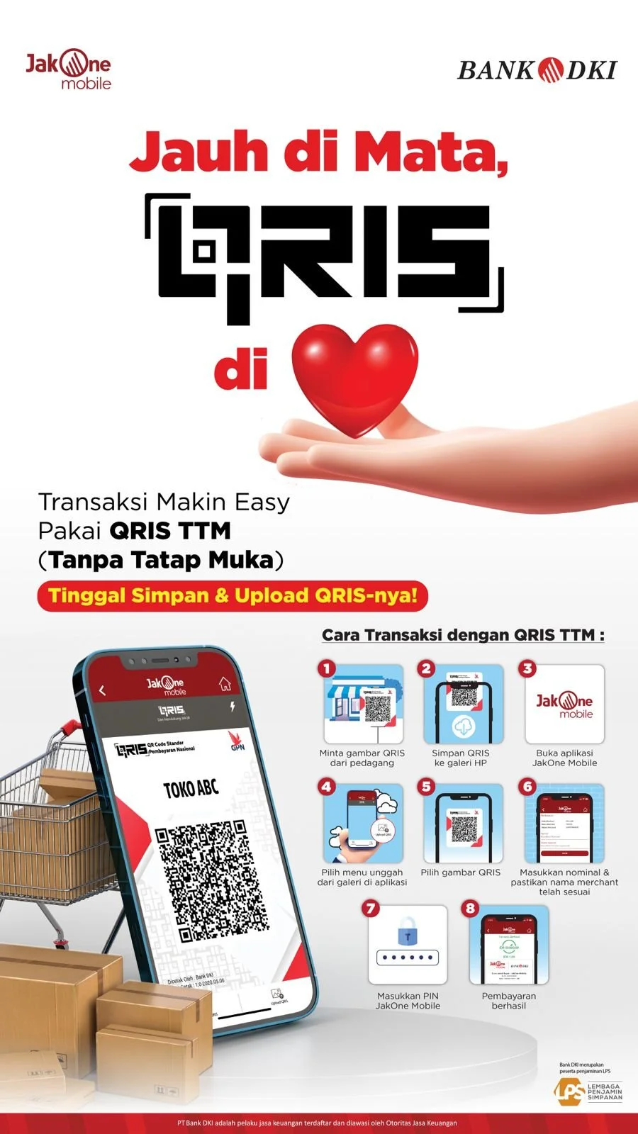 QRIS TTM (Tanpa Tatap Muka) adalah suatu inovasi baru dalam metode pembayaran cashless, dimana para konsumen tetap dapat melakukan transaksi pembayaran secara online walau tidak bertemu langsung dengan pedagang. Caranya kamu tinggal simpan di galeri QRIS merchant/toko yang ingin kamu bayar, lalu tinggal upload QRIS tersebut pada saat ingin transaksi Scan QRIS di JakOne Mobile.