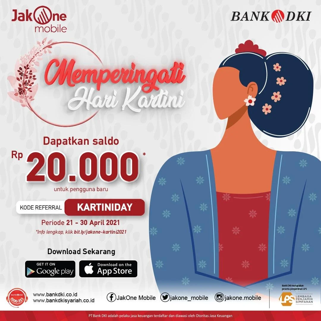 Dalam rangka memperingati Hari Kartini , ada promo menarik nih buat kamu yang masih belum download JakOne Mobile, jangan lupa gunakan Kode Referral KARTINIDAY untuk dapetin FREE Saldo Rp 20.000,-