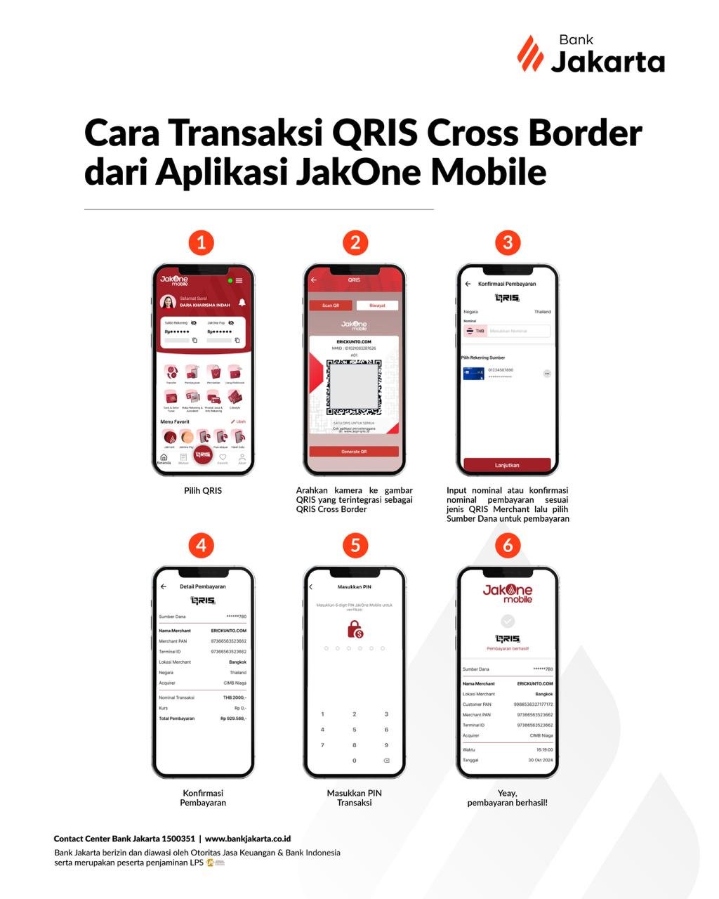 Nasabah cukup membuka aplikasi JakOne Mobile, memilih menu pembayaran QRIS, lalu memindai QR code merchant di negara mitra. Proses transaksi dilakukan secara real-time.