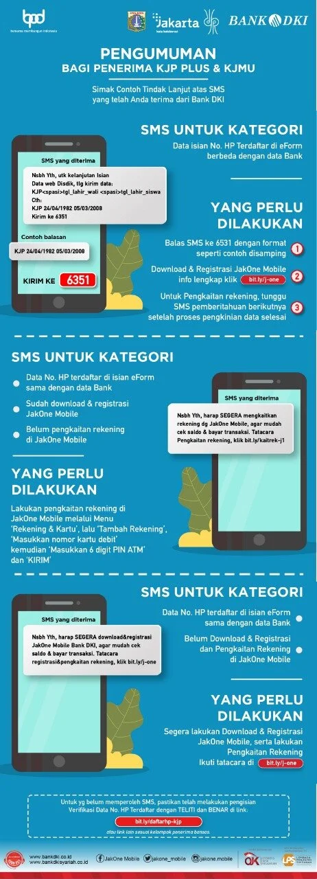 Apabila sudah mendapatkan SMS tersebut, bapak/ibu/sdr WAJIB segera melakukan tindak lanjut sesuai petunjuk di atas. Untuk yg belum memperoleh SMS, pastikan telah melakukan pengisian Verifikasi Data No. HP Terdaftar dengan TELITI dan BENAR di link: bit.ly/daftarhp-kjp atau link lain sesuai kelompok penerima bansos.