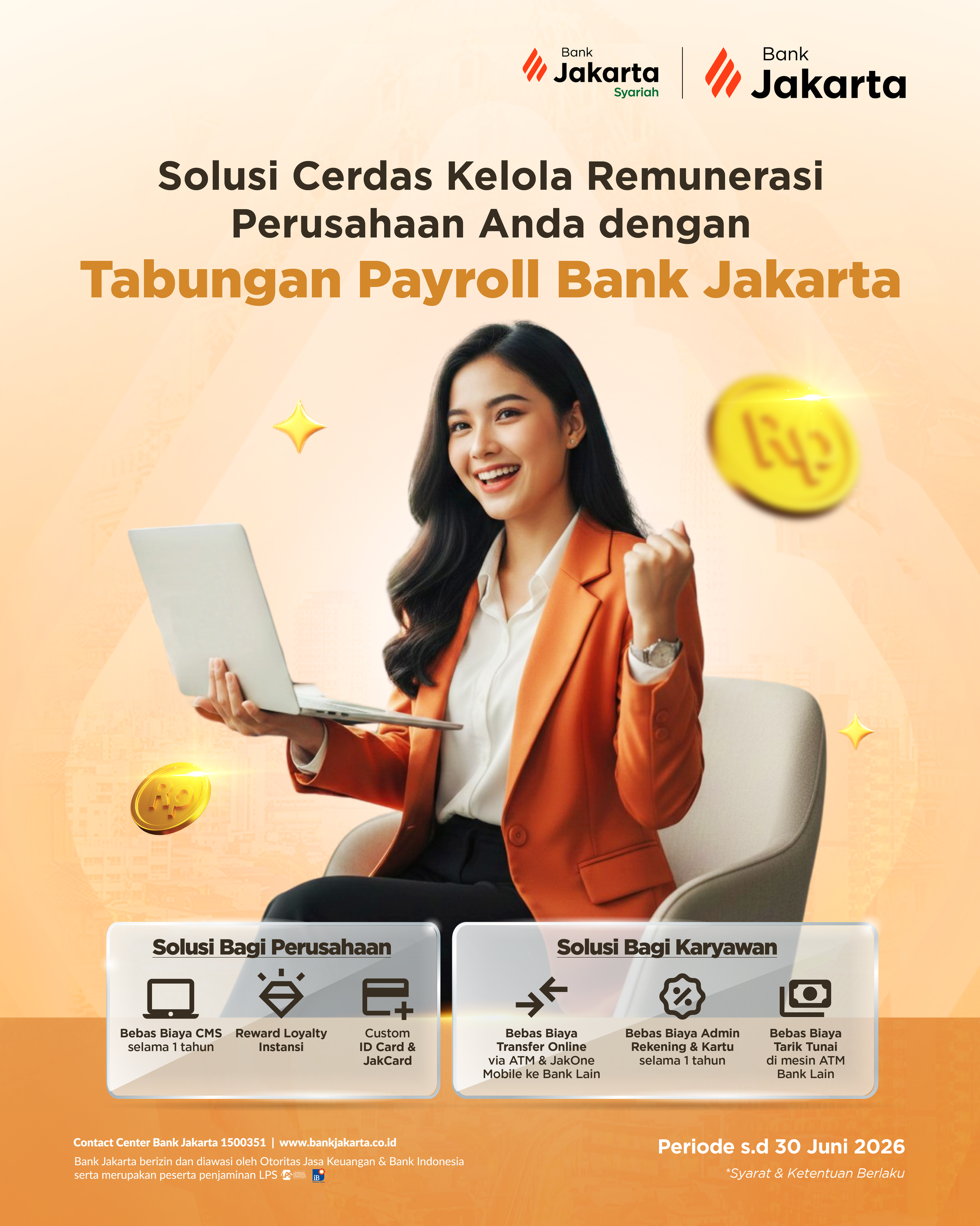 Mengelola payroll kini semakin praktis, aman, dan tepat waktu. Melalui Solusi Layanan Payroll, Bank Jakarta menghadirkan kemudahan pembayaran gaji sekaligus berbagai manfaat tambahan bagi instansi dan karyawan.