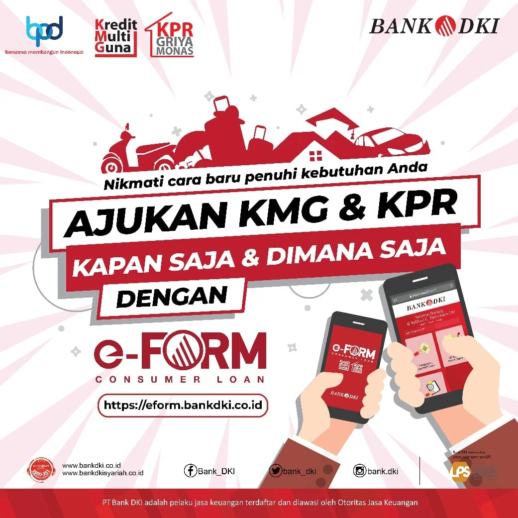 Sekarang ga perlu repot lagi datang ke Bank, cukup #diRumahAja isi e-Form, Bapak-Ibu bisa langsung membuat pengajuan untuk Kredit Multi Guna (KMG) dan Kredit Pemilikan Rumah (KPR) kapan aja dimana aja.
