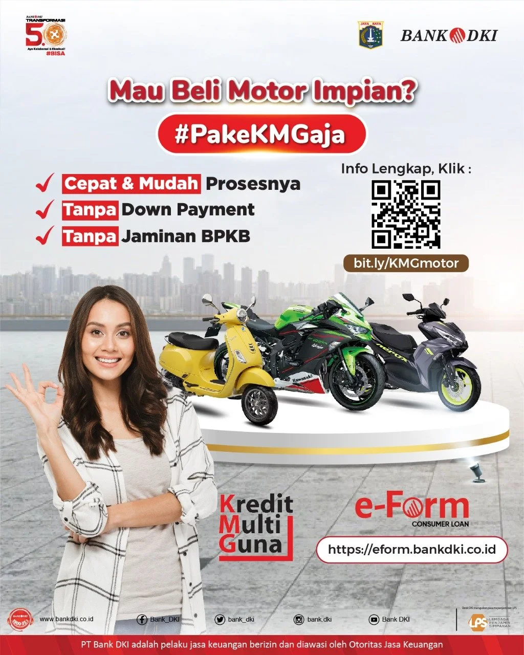 Ingin beli Motor impian? Kami bantu wujudkan impian itu melalui Kredit Multi Guna (KMG) Bank DKI. Proses cepat dan mudah, tanpa uang muka dan tanpa jaminan BPKB. Mudah bukan?