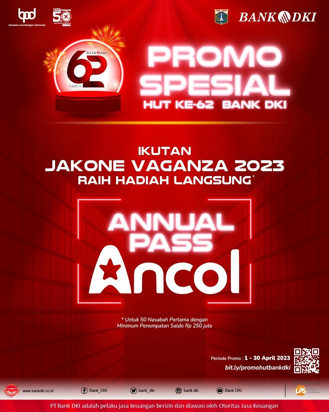 Dalam rangka memeriahkan HUT Bank DKI ke-62 maka untuk nasabah yang ikut serta program New JakOne Vaganza periode 01 April s.d 30 April 2023 akan mendapatkan hadiah tambahan berupa gratis annual pass Ancol untuk kuota 50 nasabah dengan minimal penempatan sebesar Rp 250.000.000 (dua ratus lima puluh juta).