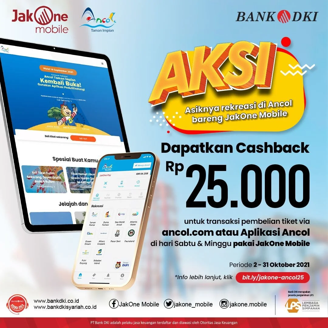 Nah, lebih serunya lagi sekarang beli tiket masuk Ancol Taman Impian dan Unit Rekreasi lainnya bisa melalui website ancol dan Aplikasi Ancol, udah gitu ya kamu bisa dapat Cashback Rp 25.000,- kalau bayarnya pakai JakOne Mobile. Yuk simak syarat ketentuannya di bawah ini yah!
