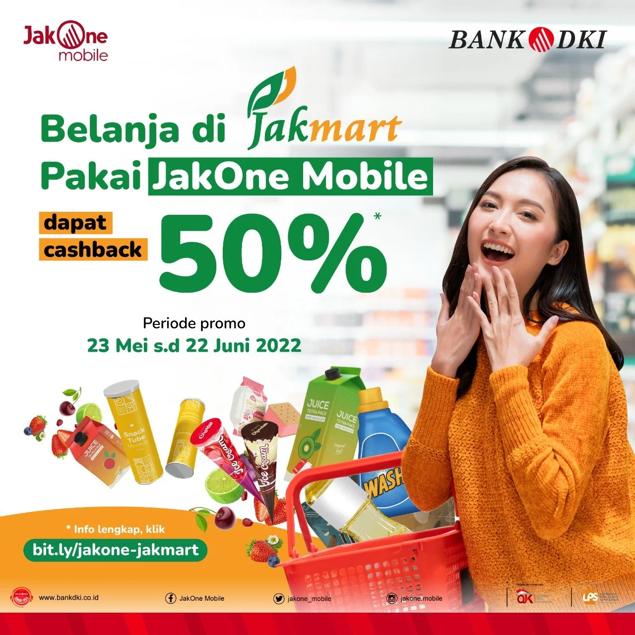 Promo cashback Belanja 50% diberikan kepada user JakOne Mobile yang melakukan transaksi pembayaran di JakMart dengan minimal transaksi Rp20.000,- (Dua Puluh Ribu Rupiah) dan maksimal cashback yang diberikan adalah Rp10.000,- (Sepuluh Ribu Rupiah).