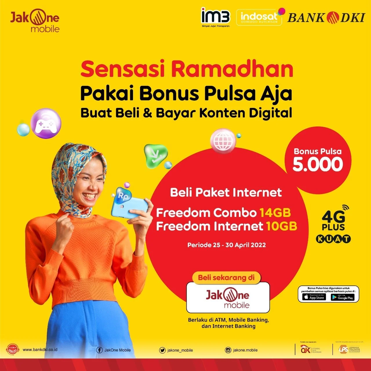 Nikmati program Sensasi Ramadhan Indosat dan dapatkan bonus pulsa Rp. 5.000,- setiap pembelian paket data Indosat Freedom Combo 14GB dan Freedom Internet 10GB pake JakOne Mobile!
