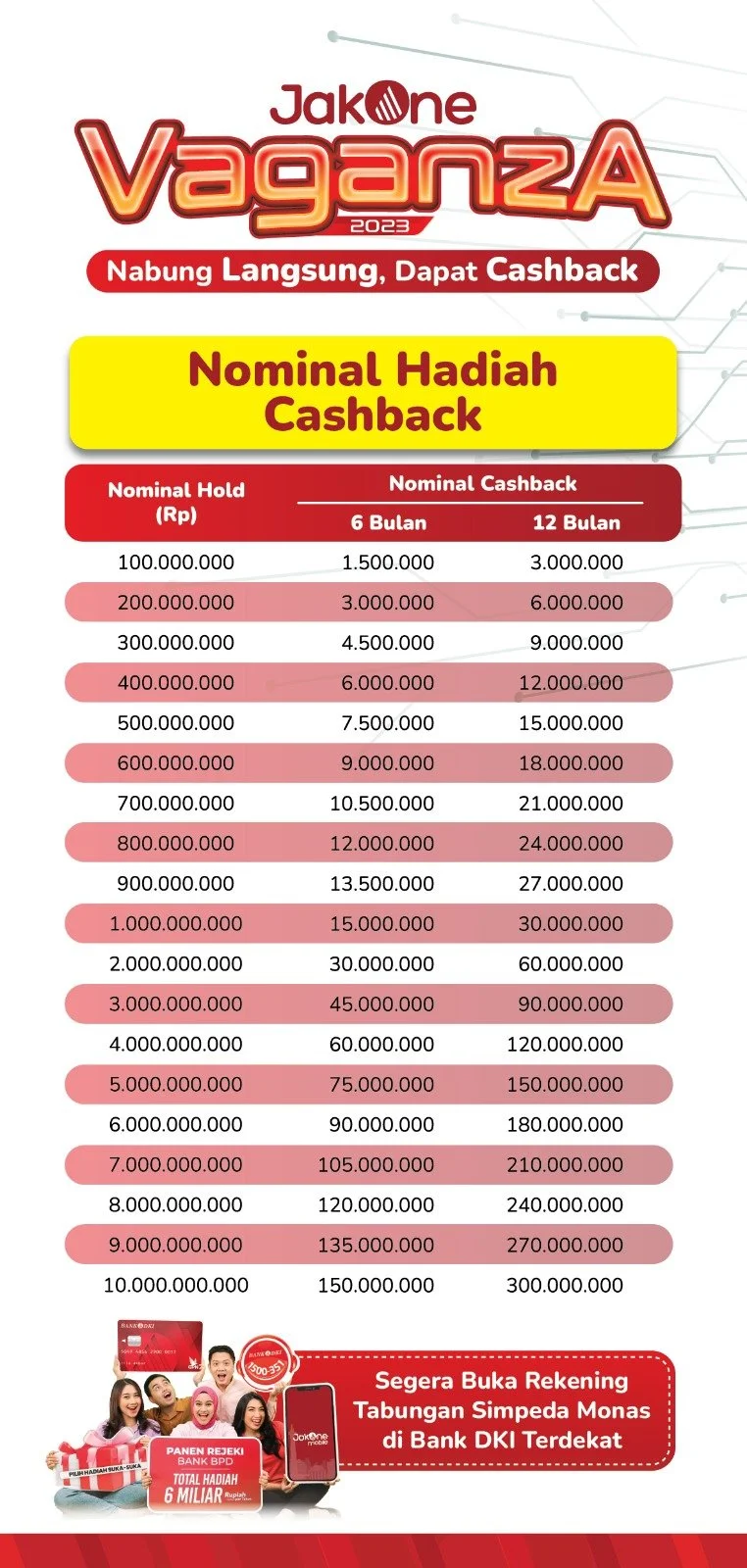 JakOne Vaganza adalah program hadiah langsung berupa pemberian cashback bagi nasabah yang bersedia menempatkan dana fresh fund di Bank DKI. Dana yang ditempatkan pada tabungan memilki kriteria sebagai berikut:
