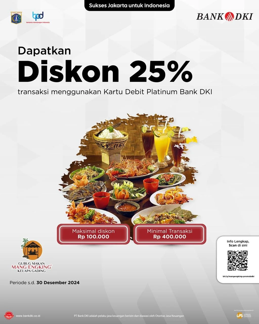 Transaksi menggunakan Kartu Debit Platinum Bank DKI maupun Scan QRIS di Mang Engking Kelapa Gading Bisa Dapat Diskon hingga 25%, yuk simak syarat & ketentuannya di bawah ini: