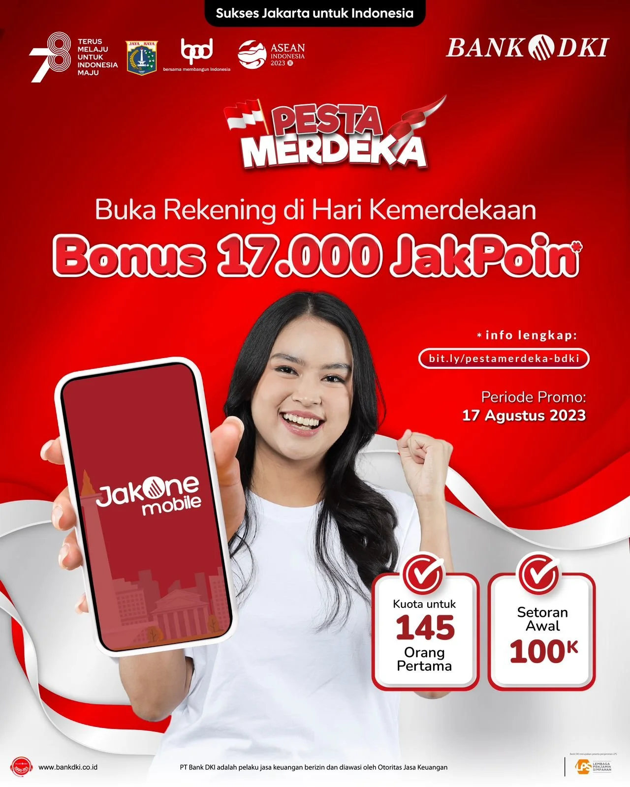 Dalam rangka memeriahkan HUT RI ke 78, Bank DKI menyiapkan rangkaian program yang dirancang khusus bagi Kamu pengguna JakOne Mobile! Program promosi dengan tema “PESTA MERDEKA : PILIH CASHBACK-NYA” siap bikin kamu makin untung bareng JakOne Mobile.