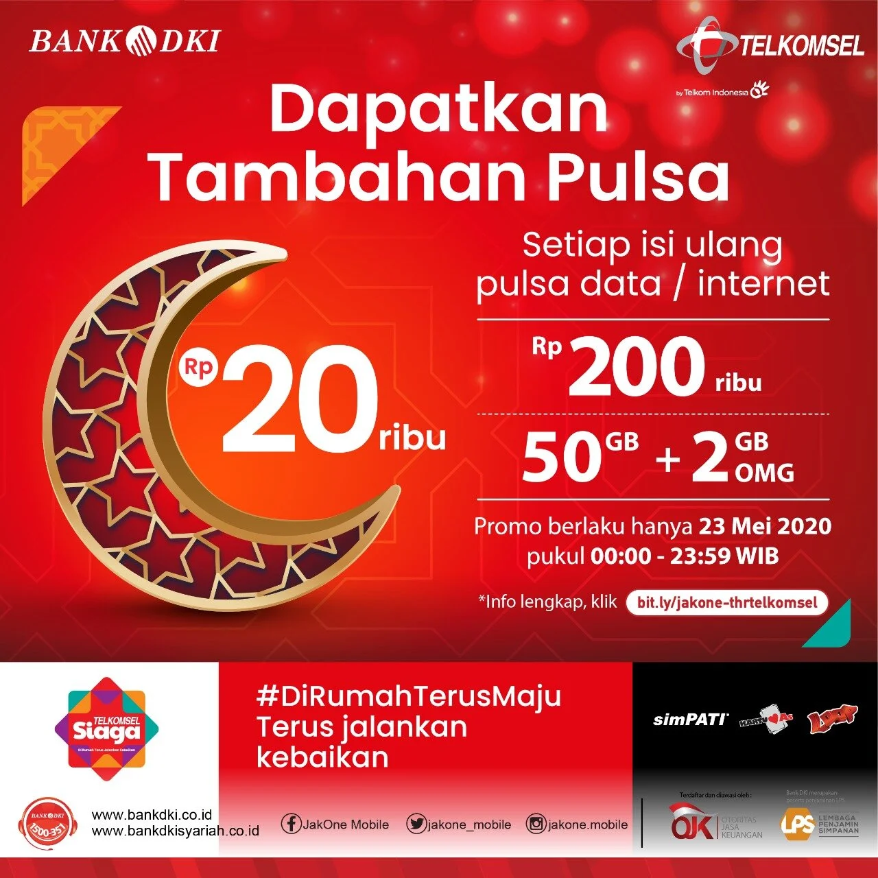 Nikmati promo Ramadhan Idul Fitri Telkomsel dan Bank DKI di hari Sabtu tanggal 23 Mei 2020 dan dapatkan Pulsa Rp. 20.000
